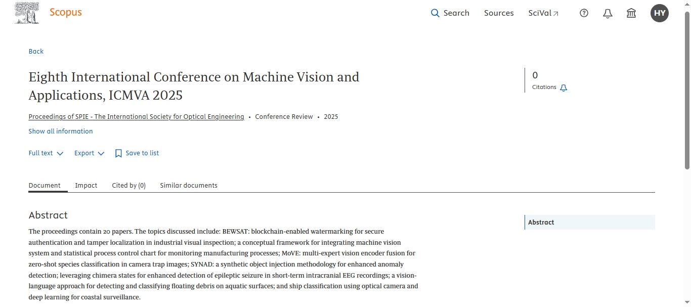 2025 The 8th International Conference on Machine Vision and Applications (ICMVA 2025) was held in Melbourne, Australia during June 12-14, 2025. The conference was sponsored by Swinburne University, University of Stuttgart, University of Tartu, supported by Okayama University, University of Évora, Gifu Shotoku Gakuen University, and National Taiwan University of Science and Technology. This conference is intended to provide a balanced introduction to machine vision. We hope that the conference results constituted significant contribution to the knowledge in these up-to-date scientific field. On behalf of the organizing committee, we appreciated all the experts and scholars from all over the world participated in this conference. Their outstanding performance inspired participants a lot. Of course, we also highly appreciate on all the participants for their efforts and time dedicated to the conference.